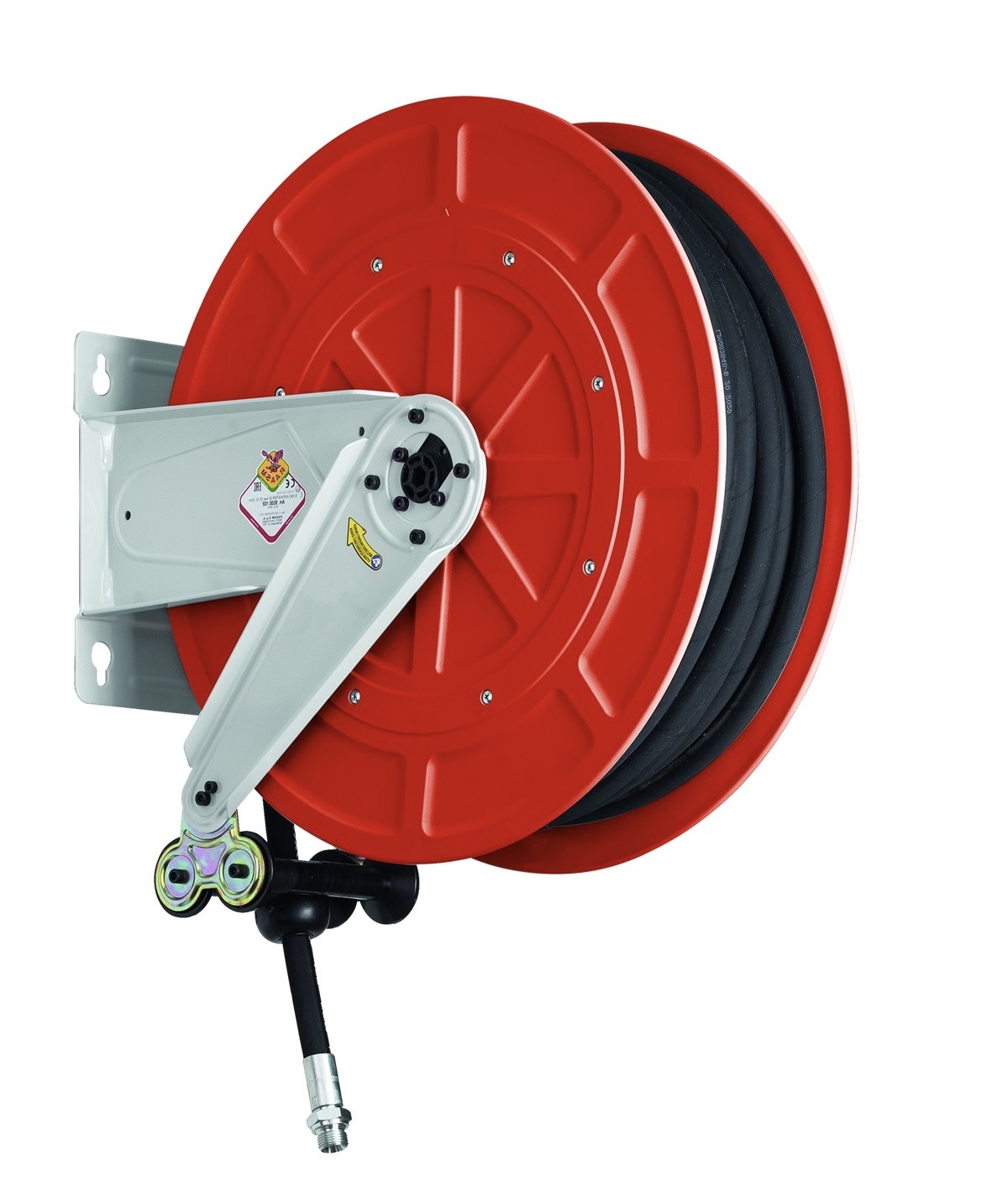 Slangetrommel i ABS og lakkert stål for høytrykk. Kan monteres på vegg eller i tak med automatisk inntrekk av slangen. Til bruk for vann og luft. Trommelen leveres med svivel som har Viton tetninger beregnet for temperaturer opptil maks. 130°C. Leveres standard med slange.