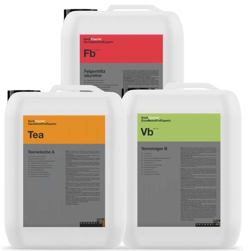 Denne pakken inneholder tre 5L dunker fra Koch Chemie, med asfaltfjerner, forvask og metallpartikkelfjerner/felgrens. Det følger også med tappekraner og reduksjonsventil til disse om man skulle ønske det.