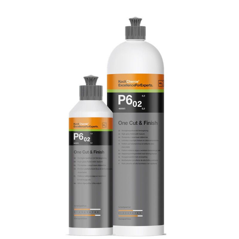 One Cut & Finish P6.02 er en videreutvikling av F6.01 Fine Cut, der det er tilsatt voks i tillegg. Det er vårt ultimate enstegsprodukt, da det fjerner relativt dype riper på myke, medium harde og harde lakker. På de mykeste lakktypene kan du risikere at den ikke avslutter perfekt, der vil M3.02 Micro Cut & Finish være et bedre valg. P6.02 fjerner riper tilsvarende P2000 slipepapir.p
